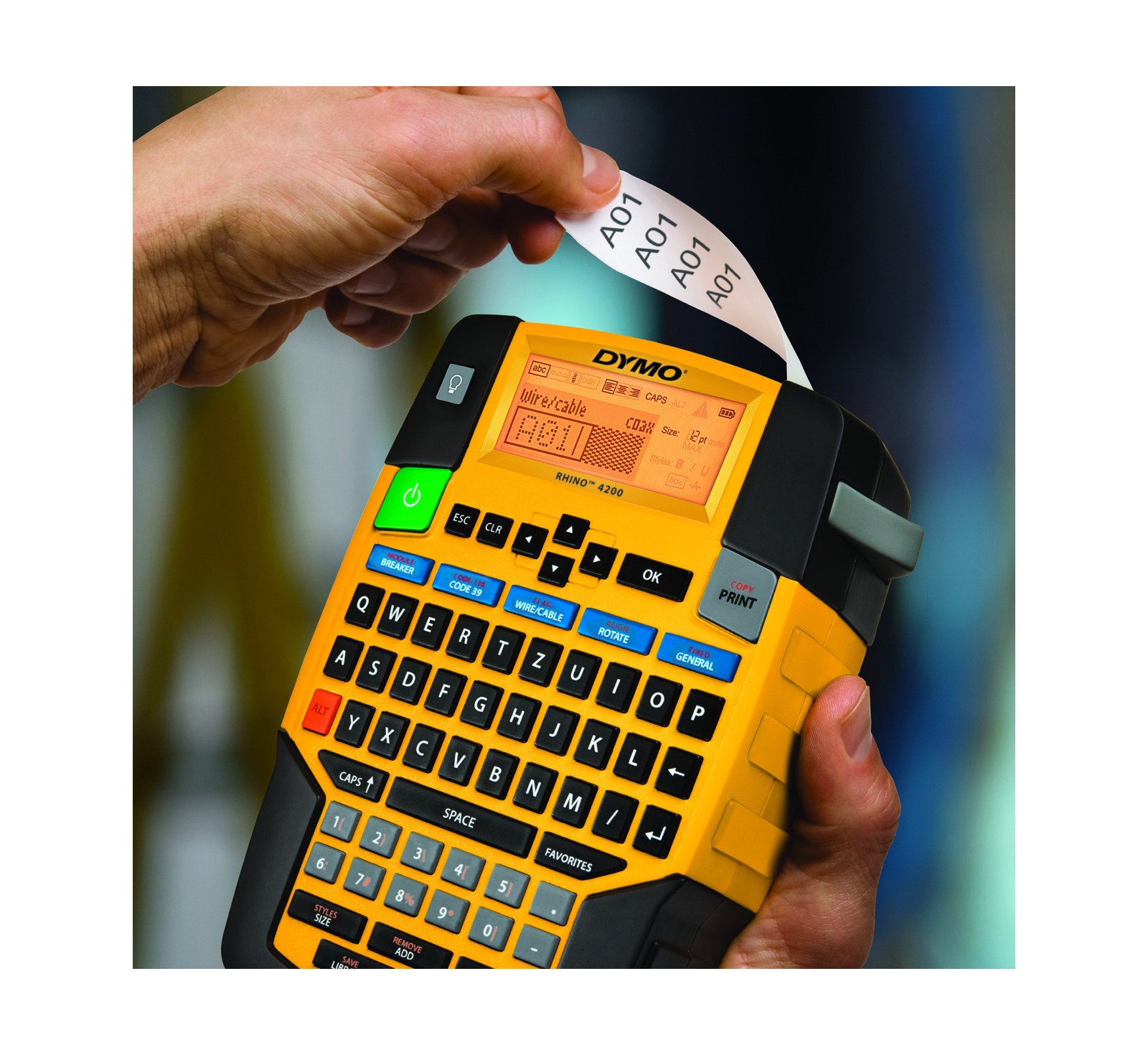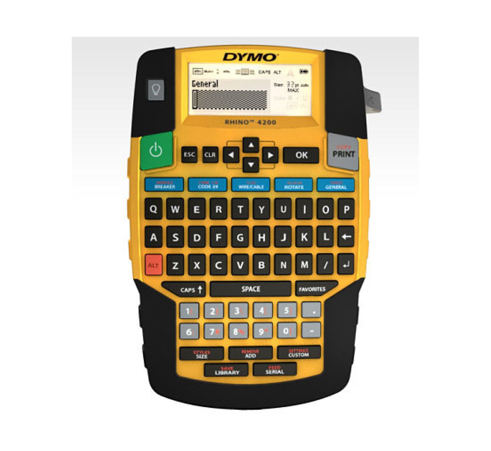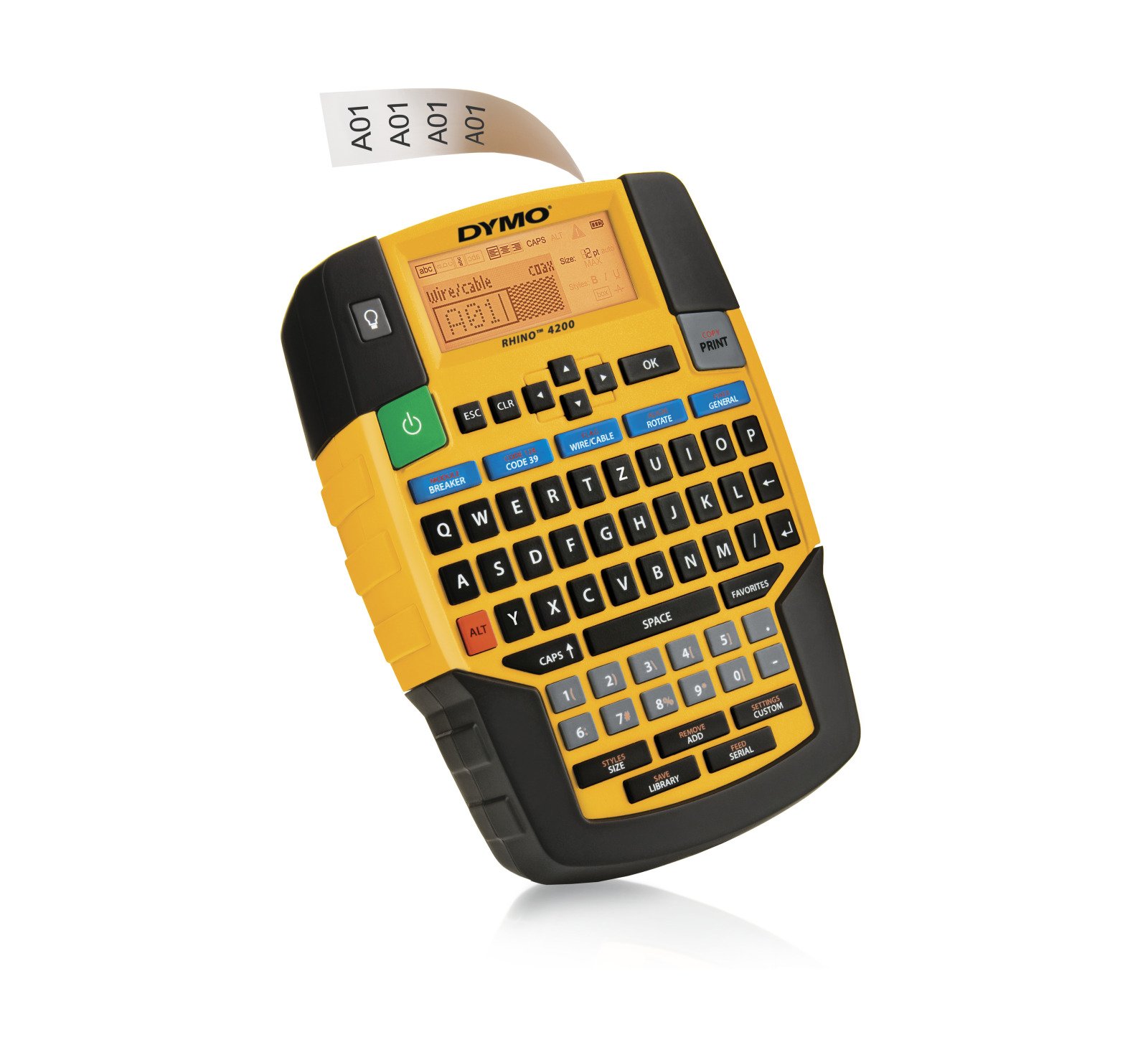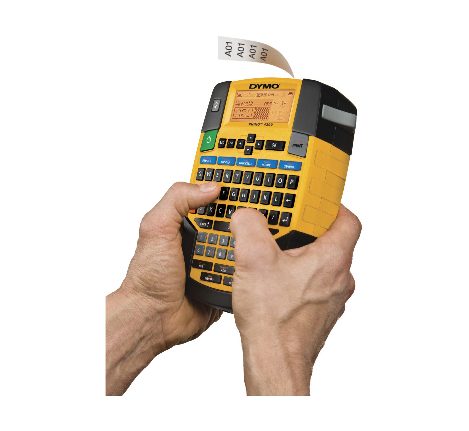Der DYMO Rhino™ 4200 erledigt Etikettierarbeiten schnell und ordentlich. Die gewohnte QWERTZ-Tastatur ermöglicht eine leichte Handhabung. Verwenden Sie die Direktzugriffstasten, um Etiketten für Draht-/Kabelummantelungen, Fähnchenetiketten, Etiketten mit fester Länge und vieles mehr schnell zu erstellen und zu formatieren. Drucken Sie bis zu 19 mm breite Etiketten in vielen verschiedenen Materialien und Farben - UND drucken Sie direkt auf Schrumpfschläuche. Gewohnte QWERTZ-Tastatur sorgt für eine einfache und schnelle Texteingabe Patentierte Direktzugriffstasten für die Erstellung und Formatierung von Etiketten für Draht-/Kabelummantelungen, Barcode 39 und Barcode 128, Etiketten mit fester Länge, Etiketten für Module und Allzwecketiketten Drucken Sie 6, 9, 12 und 19 mm breite Etiketten mit Industrieklebstoff in vielen verschiedenen Materialien und Farben - UND drucken Sie direkt auf Schrumpfschläuche Favoritentaste bietet Zugriff über nur eine Taste auf Ihre am häufigsten verwendeten Etiketten, Symbole und Begriffe Vermeiden Sie mit der benutzerspezifischen Taste die Wiederholung von Vorgängen – passen Sie Ihre Einstellungen für individuelle Etikettenformate an und speichern Sie sie Im Lieferumfang enthalten: Rhino™ 4200-Drucker 12 mm breites, weißes Vinylband Kurzanleitung Garantie-Informationen: 1 Jahr Garantie